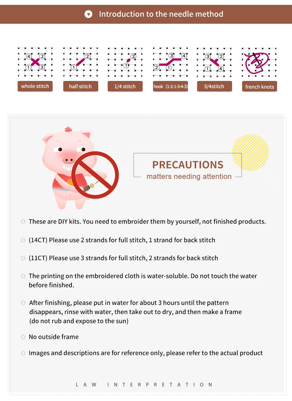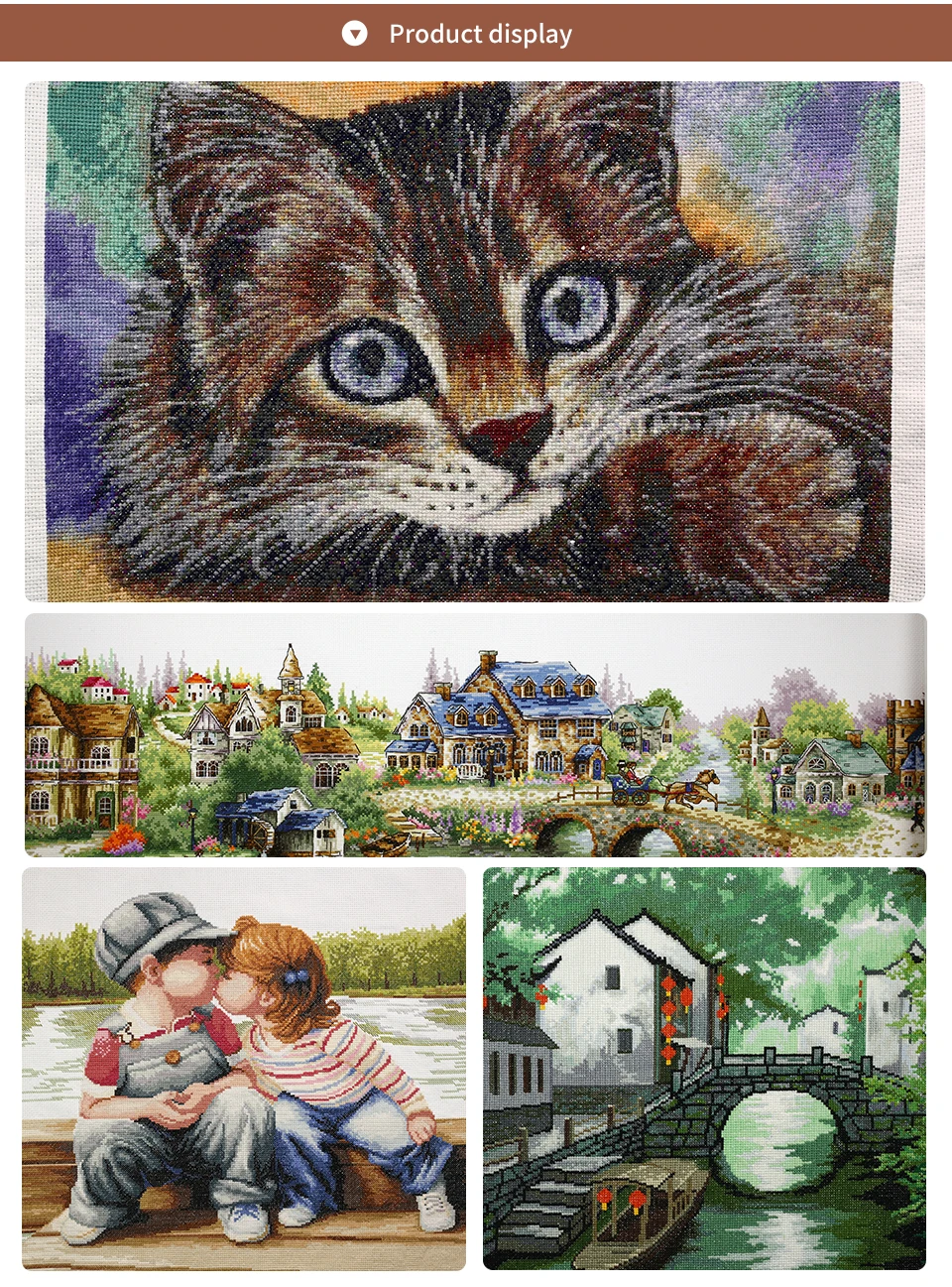 4. Printed cloth products (for example: 14CT printed cloth products and 11CT printed cloth products), the patterns of which have been printed on the canvas, therefore, before the cross stitch is completed, the embroidery cloth cannot touch the water, otherwise the printed part will disappear.