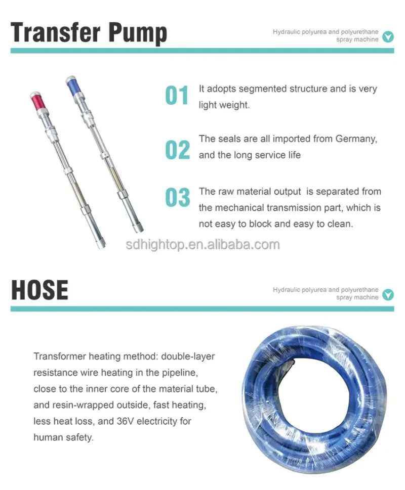 Product advantages: 1. Hydraulic drive, stable pressure, strong power, high working efficiency, not affected by seasons; 2. Multiple filtration design reduces the occurrence of spray gun clogging and improves production efficiency; 3. The main power leakage protection system can protect the safety of the operator; 4. Equipped with an emergency switch system to respond to emergencies as quickly as possible; 5. (The main unit has a 6-cylinder heater on one side, heating faster, more uniformly, and with high efficiency) The 380V heating system can quickly heat the raw materials to an ideal state, meeting the requirements of normal construction of the equipment in cold areas; 6. Pipe heating adopts 3500W isolation transformer device, safe, efficient and fast heating fast; 7. The latest spray gun has the advantages of small size, light weight and low failure rate; 8. The material lifting pump adopts a large variable ratio method, which can easily supply materials when the viscosity of the raw materials is high in winter; 9. The equipment operation panel has user-friendly settings, making it easy to master the operation method; 10. One machine has multiple uses and can be used for two-component: polyurea spraying and rigid foam polyurethane Spray coating, full water polyurethane spray coating, polyurethane Ester pouring, etc. (spray gun needs to be replaced); 11. The company has passed high-tech, ISO001 national International quality system certification; products passed the European Alliance CE certification; has more than 50 national patents Profitable, advanced technology and quality assurance.