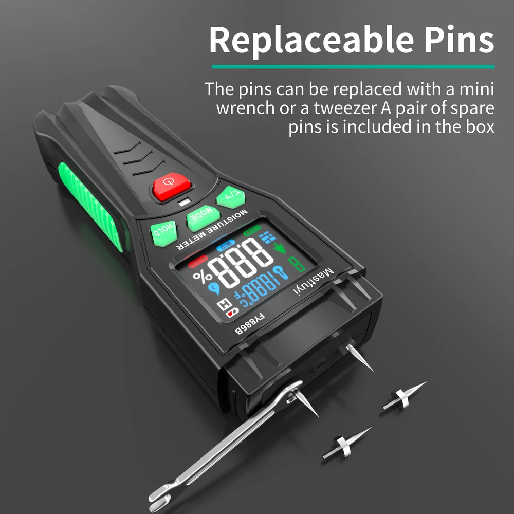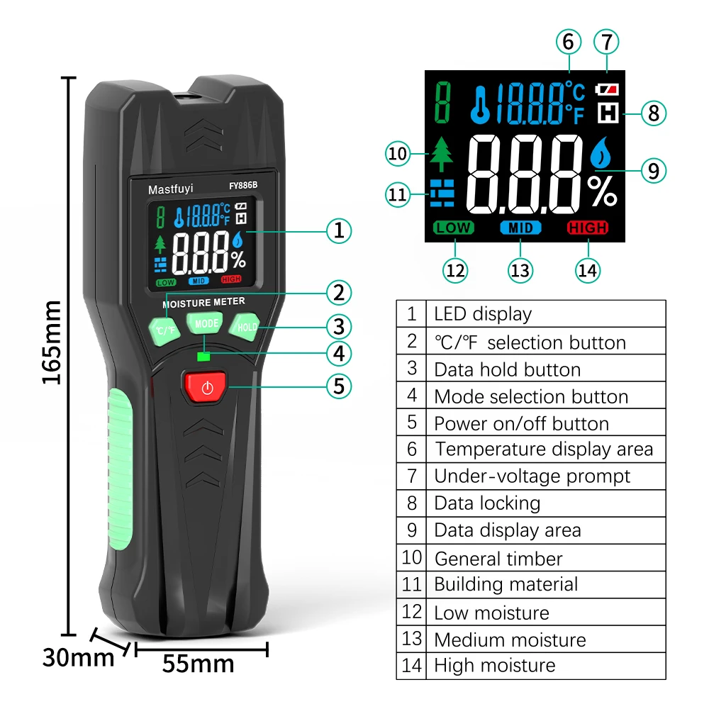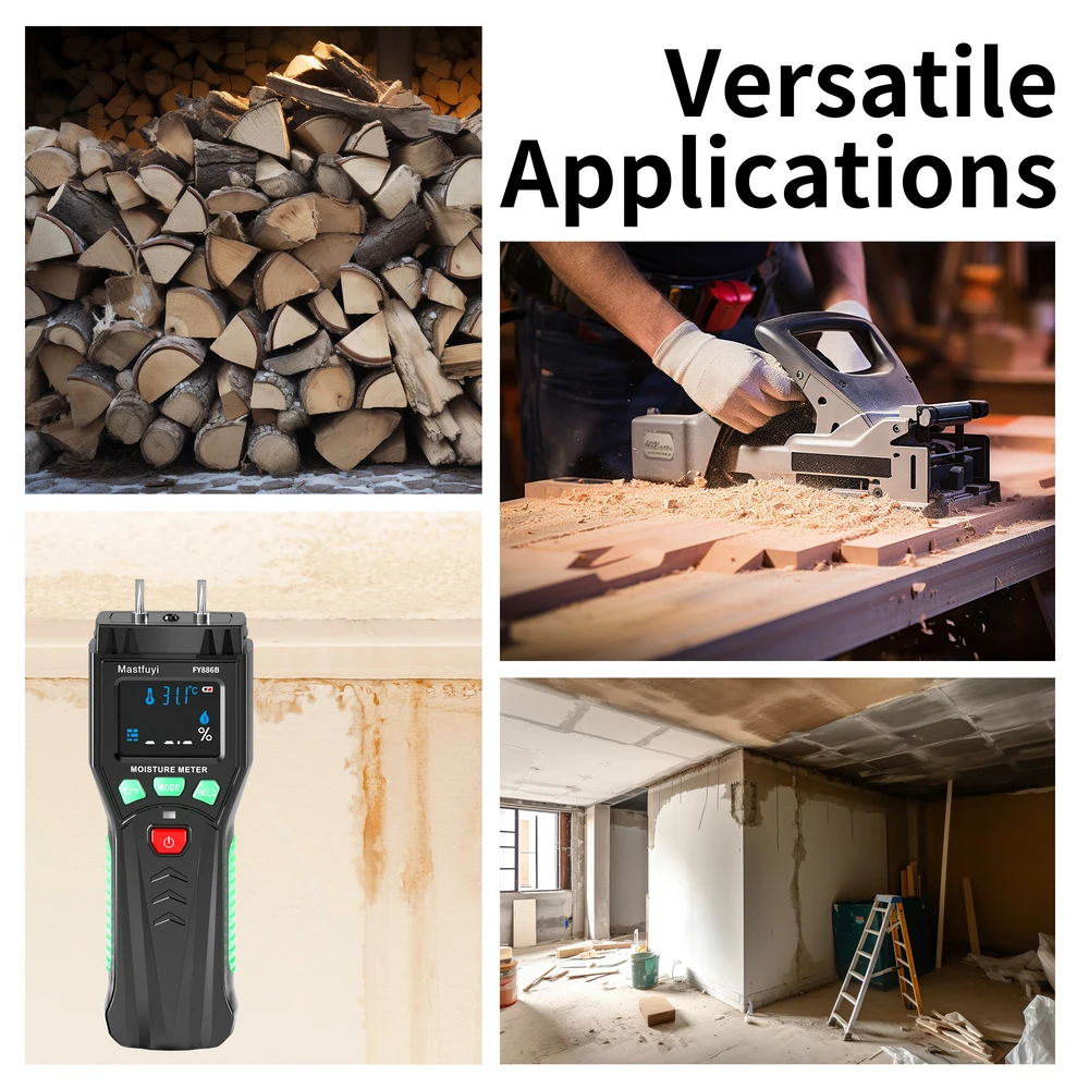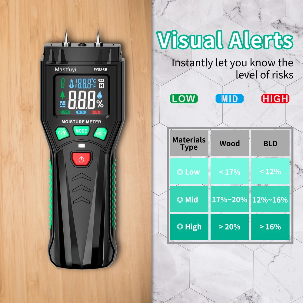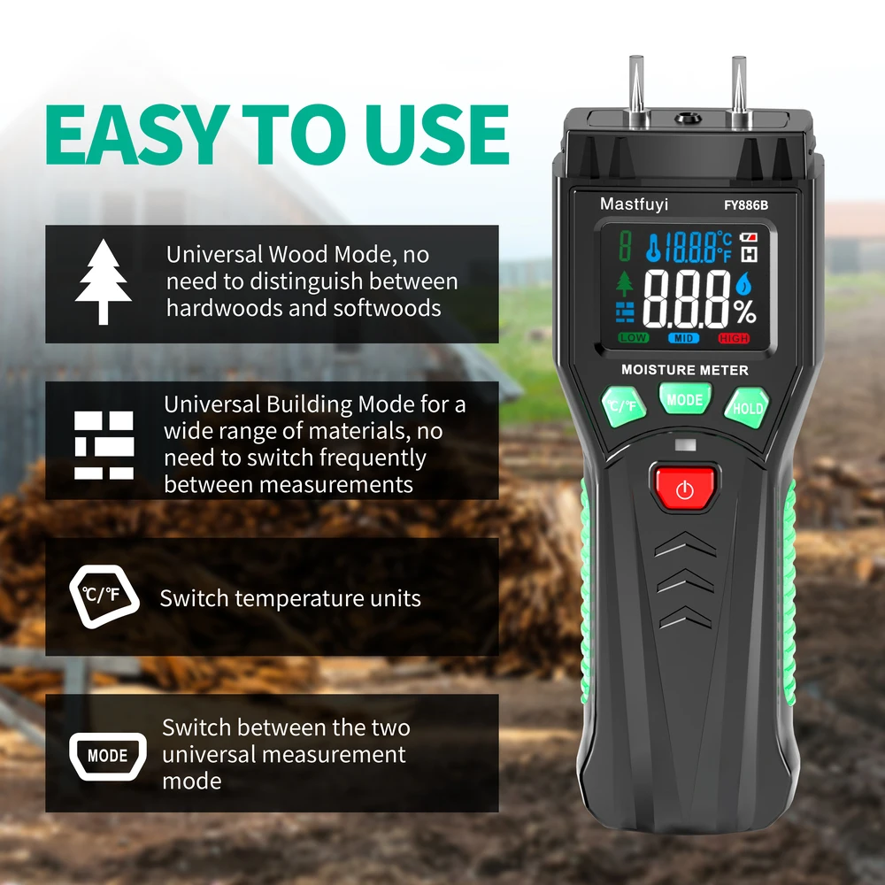 MASTFUYI FY886B is a multifunctional moisture testing meter. The instrument buttons are easy to operate, and the screen display effect is intuitive and vivid. It is a multifunctional instrument powered by batteries that can measure moisture and ambient temperature. It is commonly used to measure the moisture content and air temperature in wood or building materials.