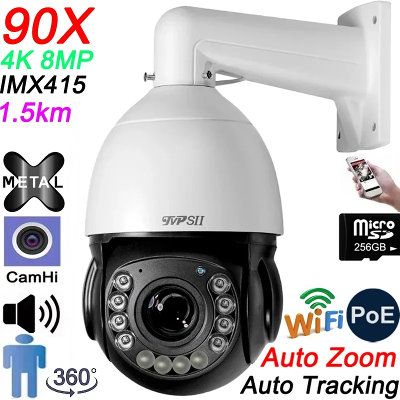 Auto Tracking CamHi H.265+ 8MP 4K IMX415 Laser Infrared 256G 90X Optical Zoom Audio 360° Rotate Alarm WIFI POE PTZ IP Camera