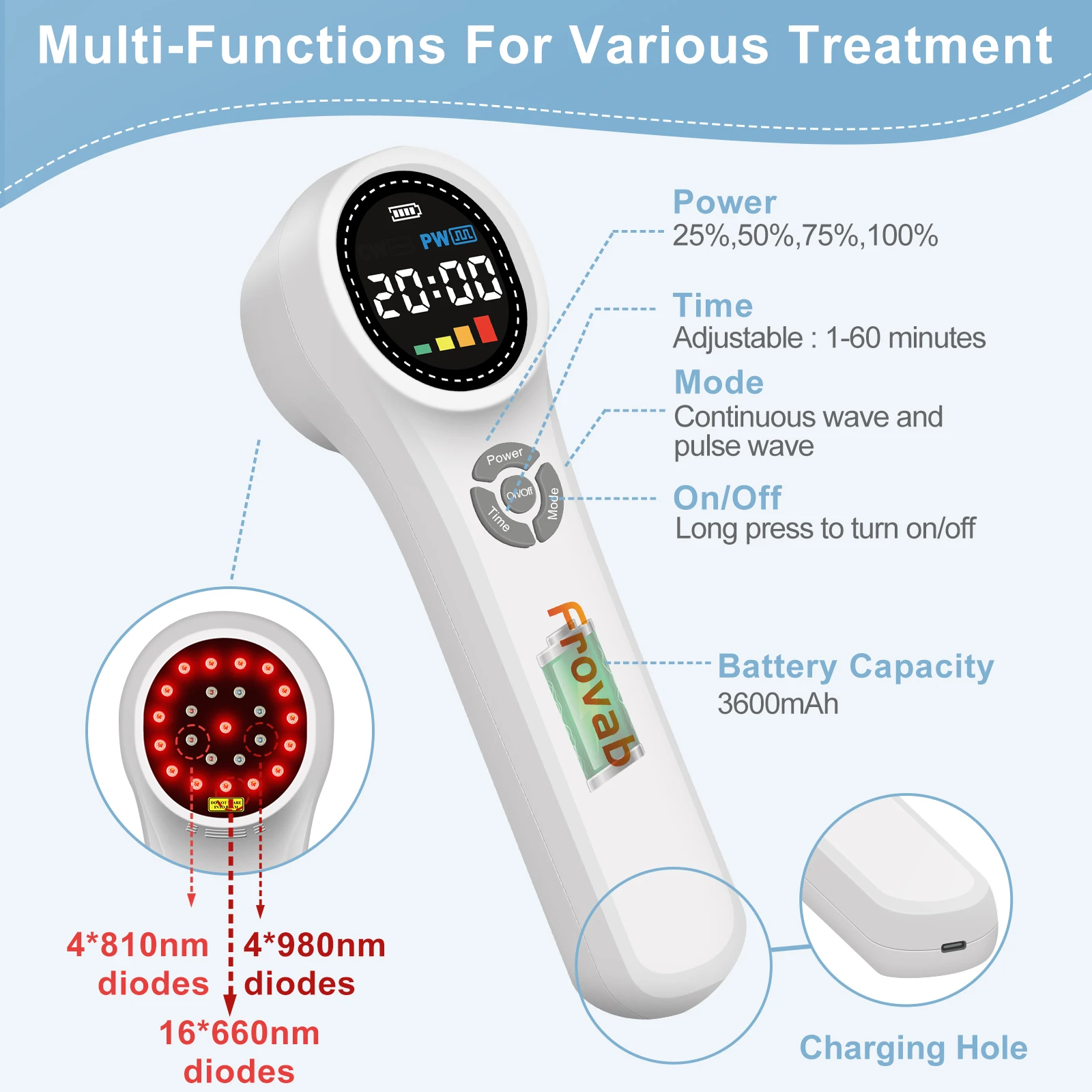 【Easy to Operate&Portable】Power:25% 50% 75% 100% four levels adjustable;Time:1 to 60 minutes adjustable;Mode:CW-continuous wave and PW-pulsed wave at 10Hz adjustable. The laser for pain relief device net weight is only 0.51lbs, simple and portable structure, with long standby and use time, you can use the laser pain management device whether at home, in the office, indoors or traveling outdoors. Simple button operation and a clear function screen is friendly for you to use.