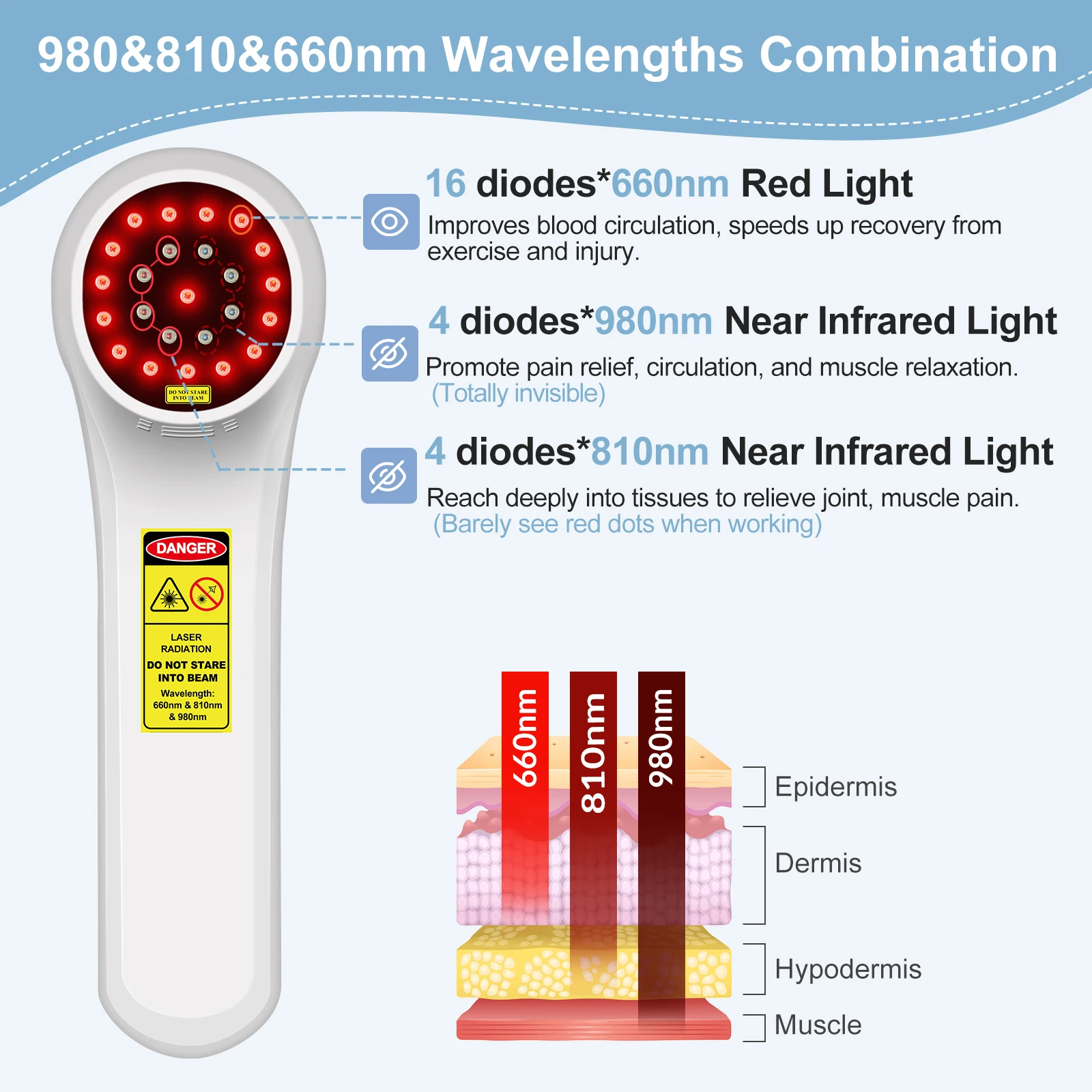 【Efficiently Relieve Pain】The red light phototherapy device combines 24pcs diode red phototherapy light to directly reach our deep tissues and relieve chronic pain. 16x660nm red light laser therapy for pain is absorbed by the skin, increase blood circulation, heal wounds and decrease infections, 4x810nm deep tissue laser therapy penetrate into deeper tissues and joints, relieve pain, repair bone and reduce inflammation, 4x980nm laser improve circulation and muscle relaxation.
