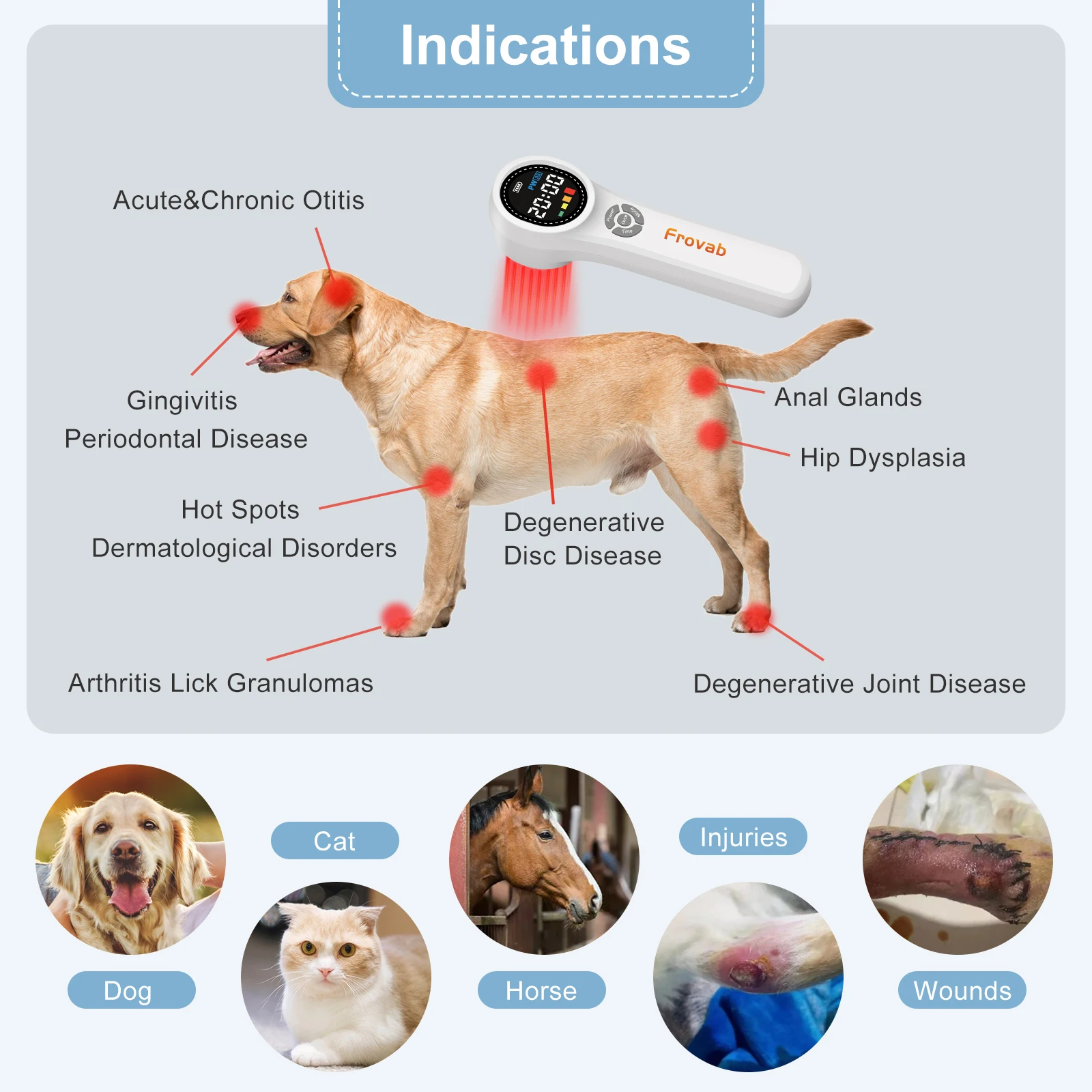 Treatable Conditions: Open Wounds, Acute and Chronic Otitis, Degenerative Disc Disease, Hip Dysplasia, Degenerative Joint Disease, Hot Spots Dermatological Disorders, Arthritis Lick Granulomas, Anal Glands, Musculoskeletal Abnormalities, Paw Pads Swelling Up, Gingivits Periodontal Disease, Inflammation, Ear Infections, Soft Tissue trauma, Chronic Arthritis, Joint Pain, Surgical Incisions, Tendon Injuries, Ligament Injuries, Traumatic Injuries and Wounds, Spinal Disc Disease, etc.