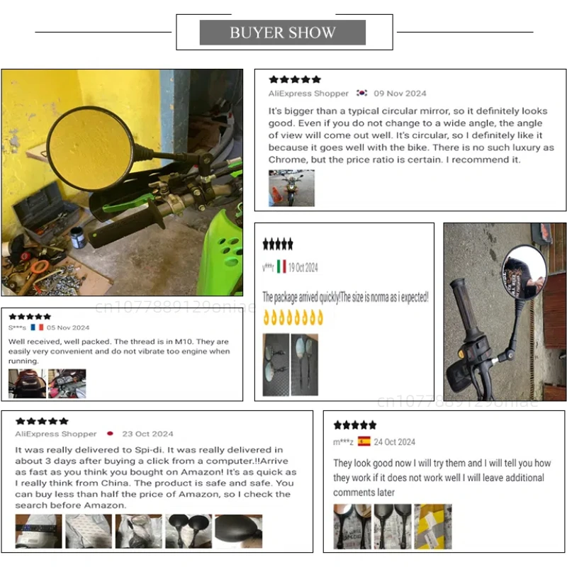 Product Name: Round Mirror Straight Rod Mirror Product Material: ABS+Aluminum Rod Product applicable model: KLX250KL250 10mm street car Product color: Black Glass color: white glass Product size: Refer to the following size chart Product weight: 495G Screw size: 10mm Product packaging: 1 set of independent packaging