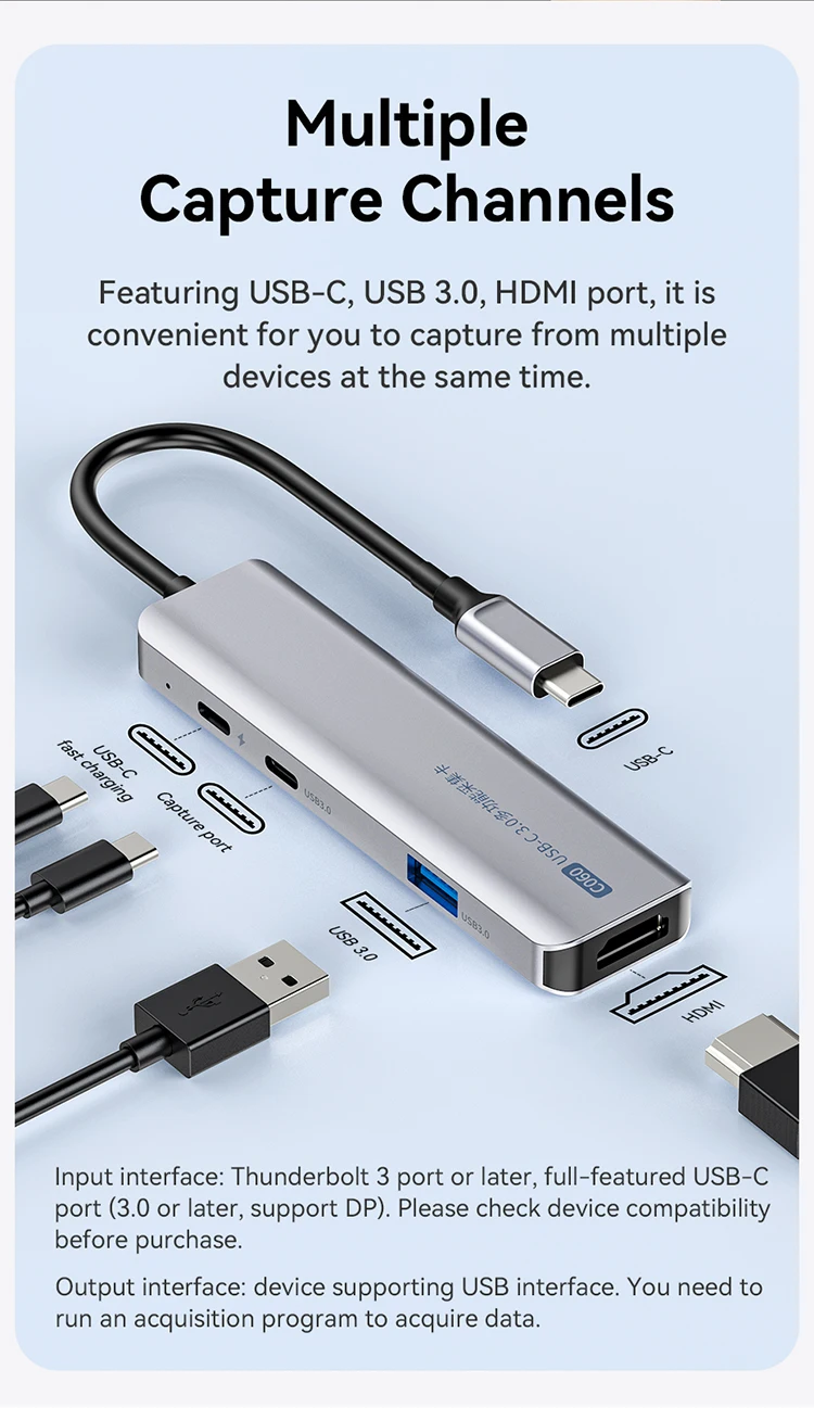 Input interface:Thunderbolt 3 port or later , full-featured USB-C port ( 3.0 or later , support DP ) . Please check device compatibility before purchase. Output interface : device supporting USB interface . You need to run an acquisition program to acquire data