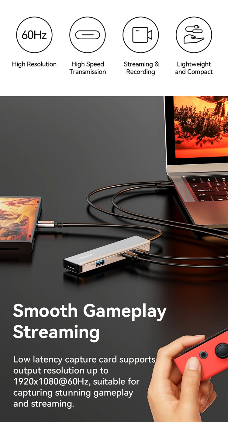 Low latency capture card supports output resolution up to 1920x1080 ( @ 60HZ , suitable for capturing stunning gameplay and streaming