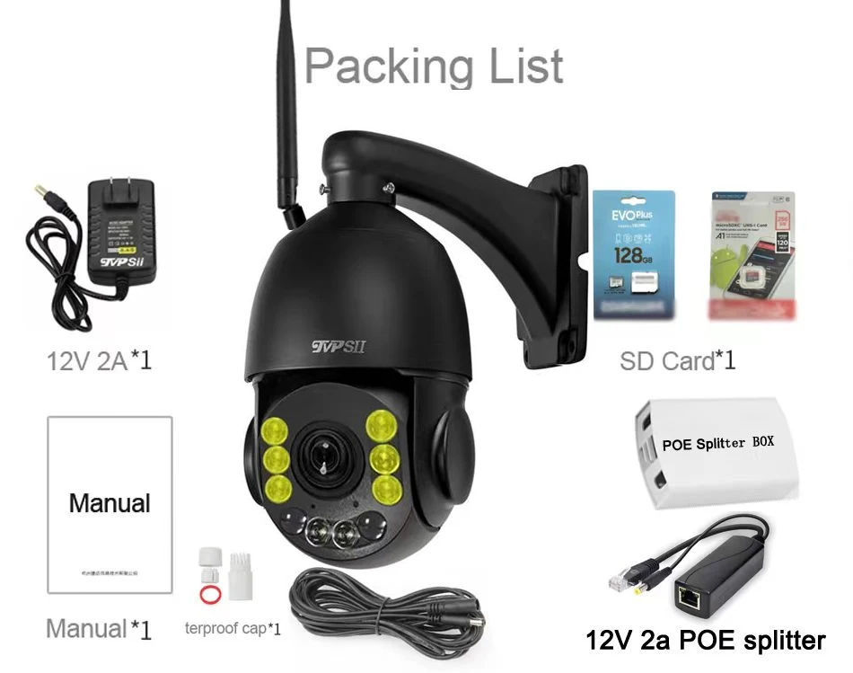 This PTZ Camera is two in one (WIFI+POE),Wifi Signal Support 2.4Ghz and 5.0Ghz,POE is use 48V to 12V 2A POE Splitter with waterproof box.