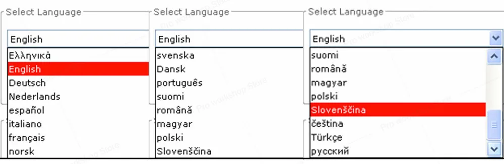 Espanol, Suomi, Magyar, Italiano, Nederlands, Norsk, Polish , Portugues, Romana, Russian, Slovenscina, Svenska, Turkce.