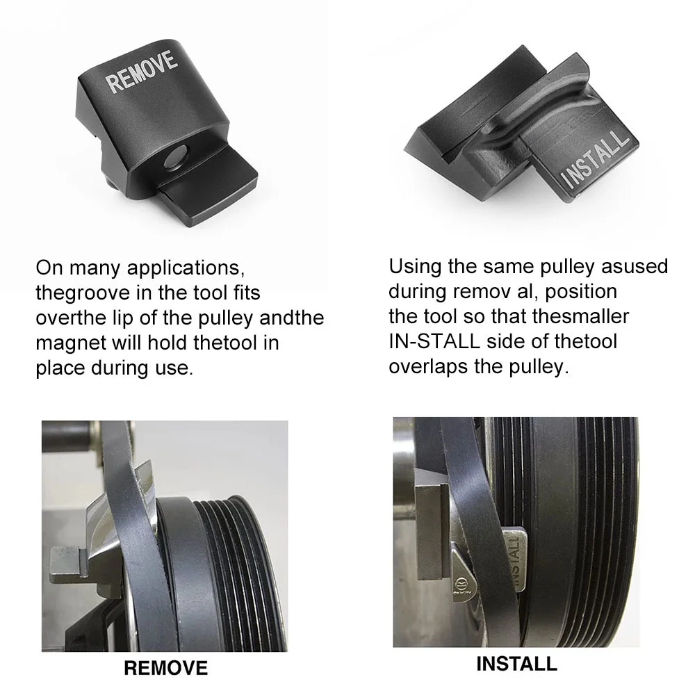 Unique magnetic faces hold the tool in place on the pulley. Helps prevent damage to belt or pulley during removal or installation. Compact, one-piece tool can be used on the front or back side of the pulley.