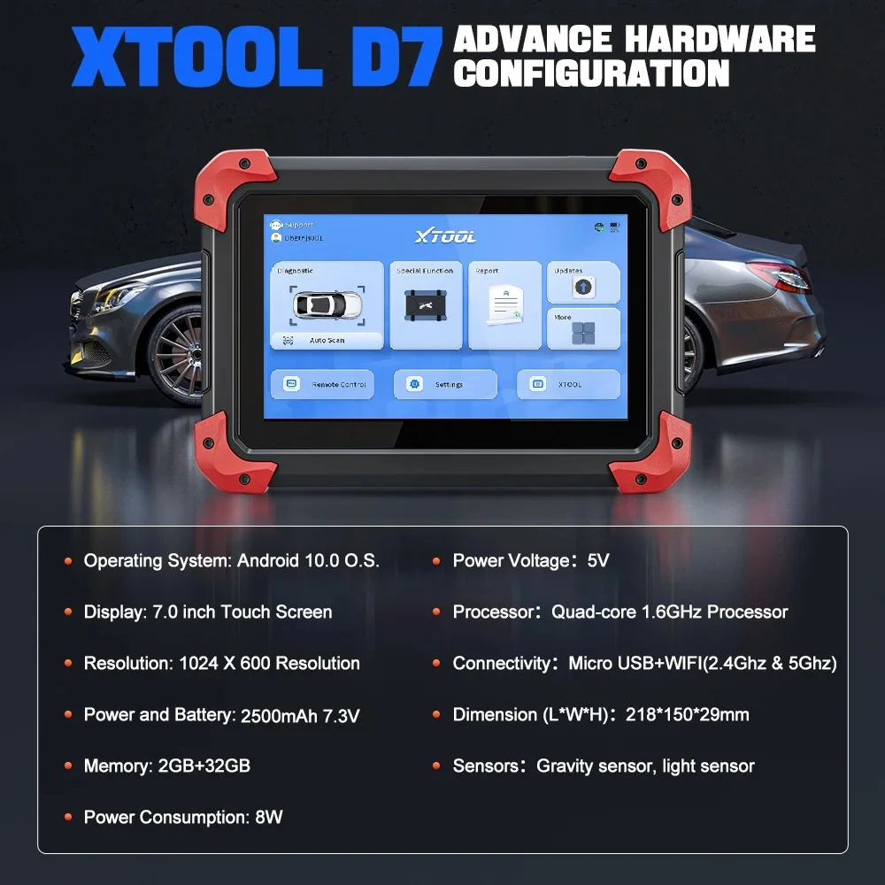 Udpate to 2.0 version,XTOOL D7 is equipped with X2 diagnostic APP and update adapter charging to Type-c charging. Type-c charging improves charging efficiency and reduces charging time. What's more,new add DOIP protocol and FCA Auto Auth.Based on the Android 10 OS, D7 features bi-directional control capability, dvanced ECU coding,all systems diagnostics, comprehensive resetsservice , and extensive vehicle coverage of 85+ car brands. In terms of hardware configuration,XTOOL D7 2.0 Version is quipped with a robust quad-core processor,2+32GB memory, a 7-inch 1024 X 600 resolution touch screen, a 2500mAh 7.3V built-in battery.