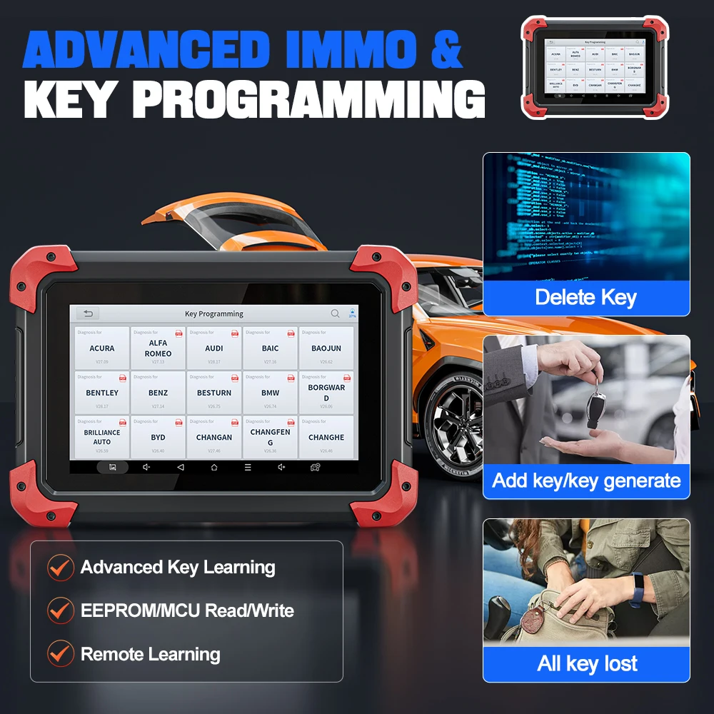OBD2 scanner XTOOL D7 IMMO service can disable a lost vehicle key and program the replacement key fob. One or more replacement key fobs can be programmed. like programming new key fobs, Read PIN code,Pin code calculation,Check number of keys, Generate key, Add key, All key lost