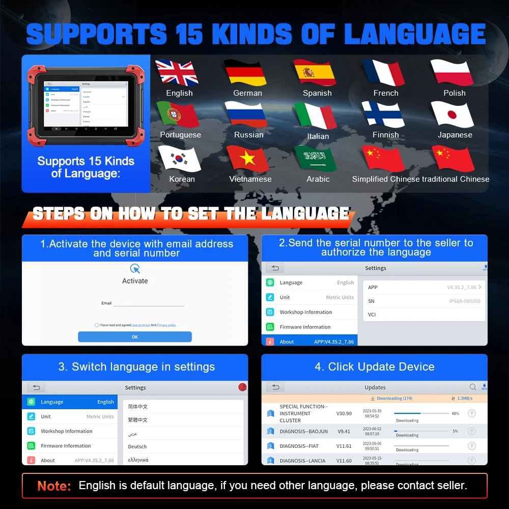 15 Kinds of Language: English, Spanish, German, French, Italian, Finnish, Arabic, Japanese, Korean, Polish, Portuguese, Vietnamese, Russian, Simplified Chinese and traditional Chinese.Tell us serial number of device after you get the package, and we will arrange to add the language for you within 24 hours on working days.
