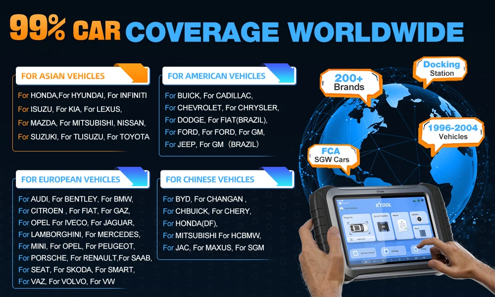 XTOOL Automotive Scanner IP919PRO Unlike factory and dealer tools that can work only for certain vehicles with limited functionalities, XTOOL scanner IP919PRO for all cars has complete database covering 99% of vehicles from 200+ diverse brands / 20,000 models
