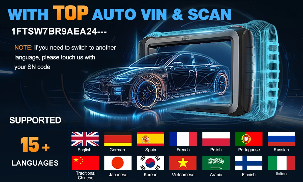 XTOOL INPLUS IP919PRO Automotive diagnostic tool covers 15+ languages for better term understanding: English, German, Spanish, French, Traditional Chinese, Japanese, Polish, Portuguese, Russian, Italian, Korean, Dutch, and etc.