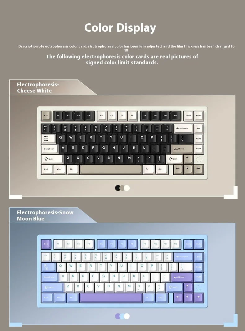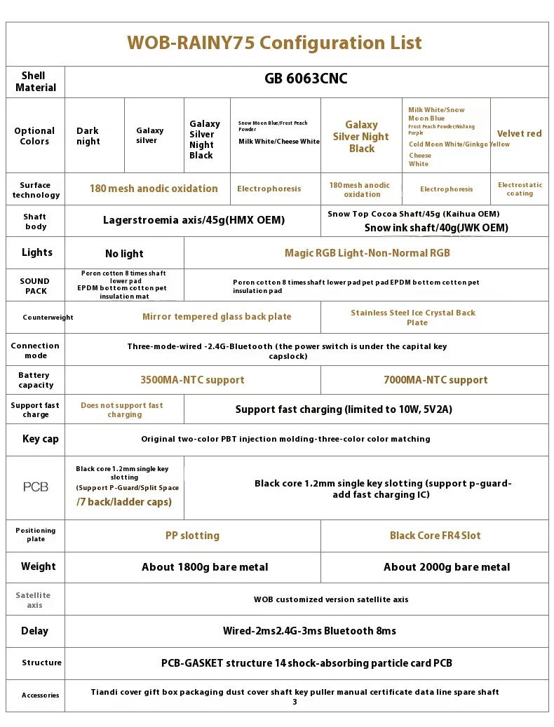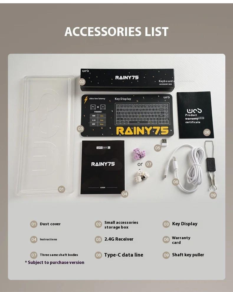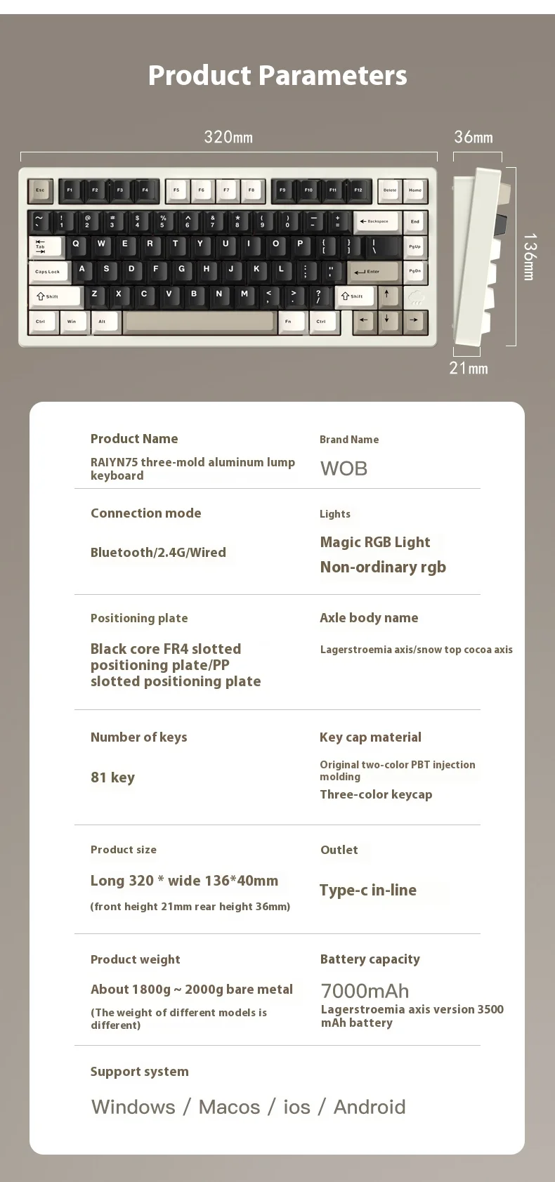Brand Name: WOB Product Name: RAIYN75 Connection mode: Bluetooth/2.4G/wired Lighting: Colorful RGB lighting is not ordinary RGB lighting Positioning board: Black core FR4 slotted positioning board/PP slotted positioning board Axis name: Purple Wisteria Axis/Snow Top Cocoa Axis Number of keys: 81 keys Key cap material: Original factory two-color PBT injection molded three color color matching key cap Outgoing port: Type-c direct insertion type Battery capacity: 7000mAh Ziwei Axis Version 3500mAh Battery Product dimensions: length 320 * width 136 * 40mm (front height 21mm, rear height 36mm) Product weight: Approximately 1800g~2000g for bare machine (weight may vary for different models) Supported systems: Windows/Macos/iOS/Android