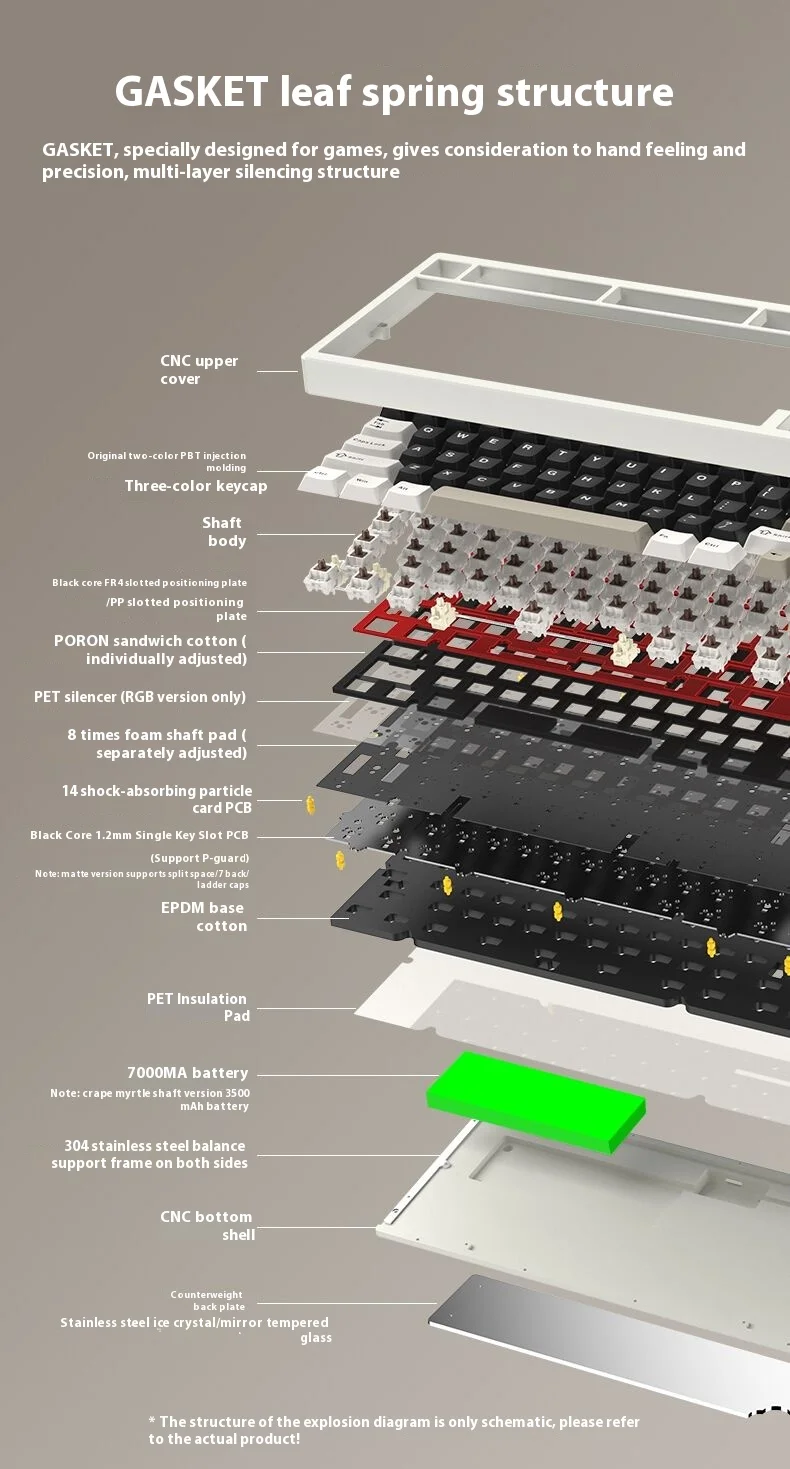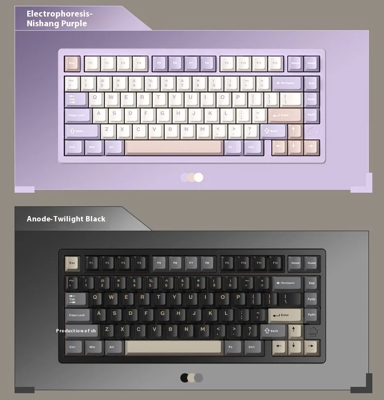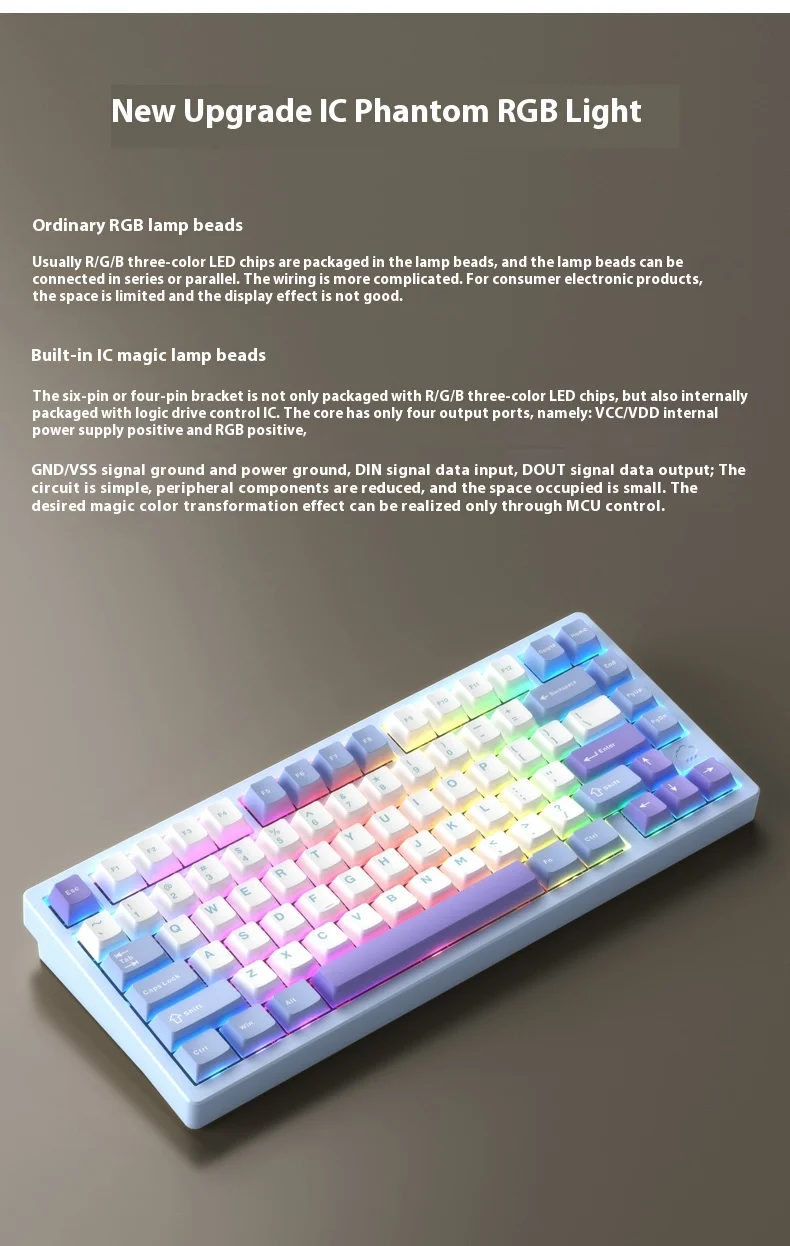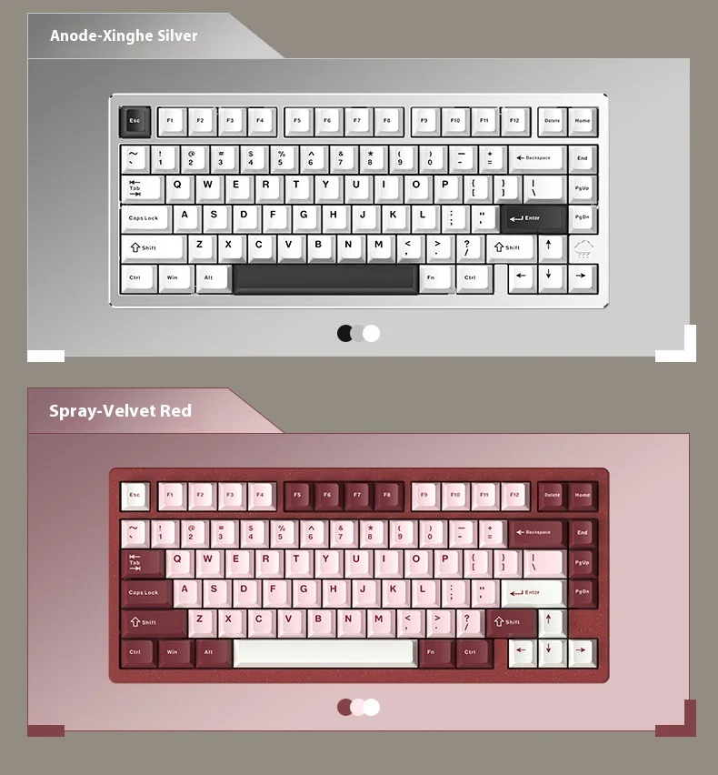Brand Name: WOB Product Name: RAIYN75 Connection mode: Bluetooth/2.4G/wired Lighting: Colorful RGB lighting is not ordinary RGB lighting Positioning board: Black core FR4 slotted positioning board/PP slotted positioning board Axis name: Purple Wisteria Axis/Snow Top Cocoa Axis Number of keys: 81 keys Key cap material: Original factory two-color PBT injection molded three color color matching key cap Outgoing port: Type-c direct insertion type Battery capacity: 7000mAh Ziwei Axis Version 3500mAh Battery Product dimensions: length 320 * width 136 * 40mm (front height 21mm, rear height 36mm) Product weight: Approximately 1800g~2000g for bare machine (weight may vary for different models) Supported systems: Windows/Macos/iOS/Android