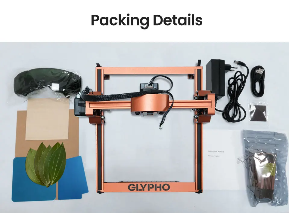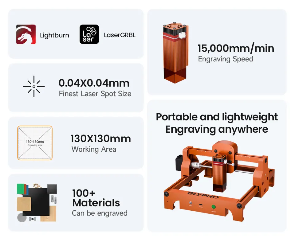 Convenient And User-Friendly Experience: Unlike traditional laser engravers, the GLYPHO S1 comes pre-assembled and ready to use right out of the box. This eliminates the hassle of assembly and guarantees an excellent user experience. Additionally, the S1 features limit switches on both the X and Y axes, ensuring safety and providing a convenient reset option.