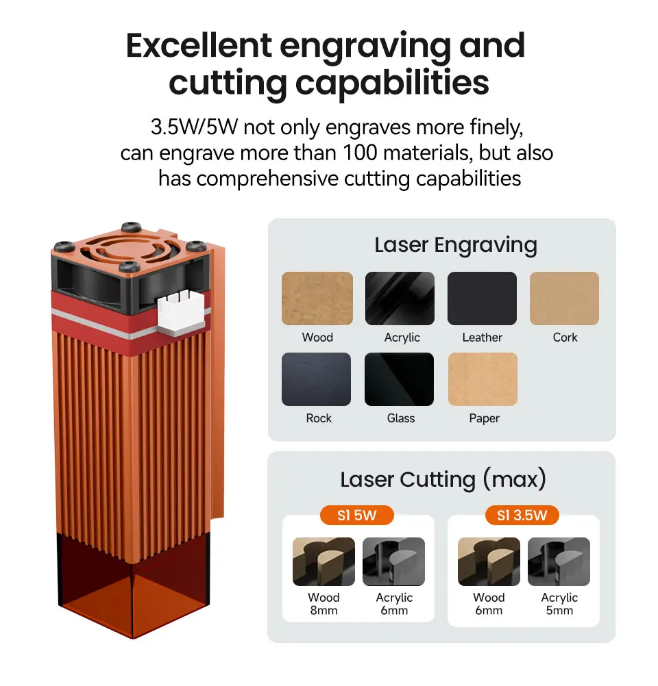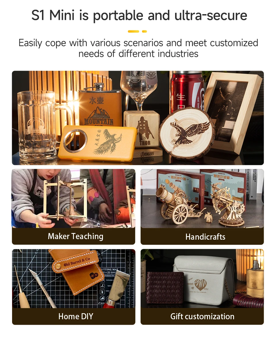 Portable And Compact Design: The GLYPHO S1 Lase Class 4 5000W Laser Engraver is the smallest portable laser engraving machine on the market, allowing users to bring it anywhere with ease. Its compact size makes it perfect for engraving on various materials such as wood, metal, acrylic, and leather .