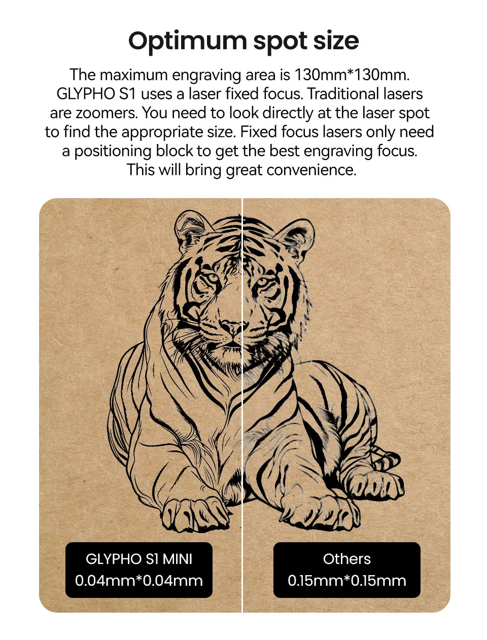Fine And Lifelike Engraving Quality: The GLYPHO S1 maintains an ultra-fine laser output, enabling users to create finely detailed and lifelike engravings on every work. Whether it's a small ornament or a ceramic piece, the S1 ensures high-quality results that truly stand out.